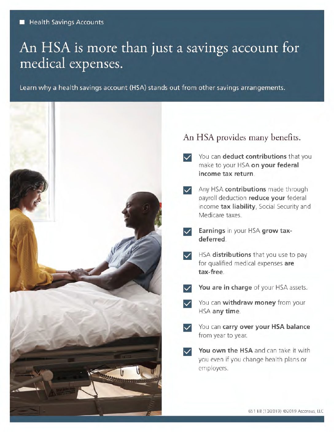 One of the major themes of HSAs is individual control. You are the primary decision-maker. You decide when to use the HSA funds to pay for medical expenses. Your employer has no control over the HSA funds. Even when you change jobs, your HSA goes with you. HSAs are designed specifically for individuals with a high deductible health plan. Members who switch to a high deductible health plan will likely enjoy lower premiums. Unlike contributions to a flexible spending account, the balance of an HSA is carried over to the next year. That means the HSA owners are not placed in a position of having to “use it or lose it” each year.