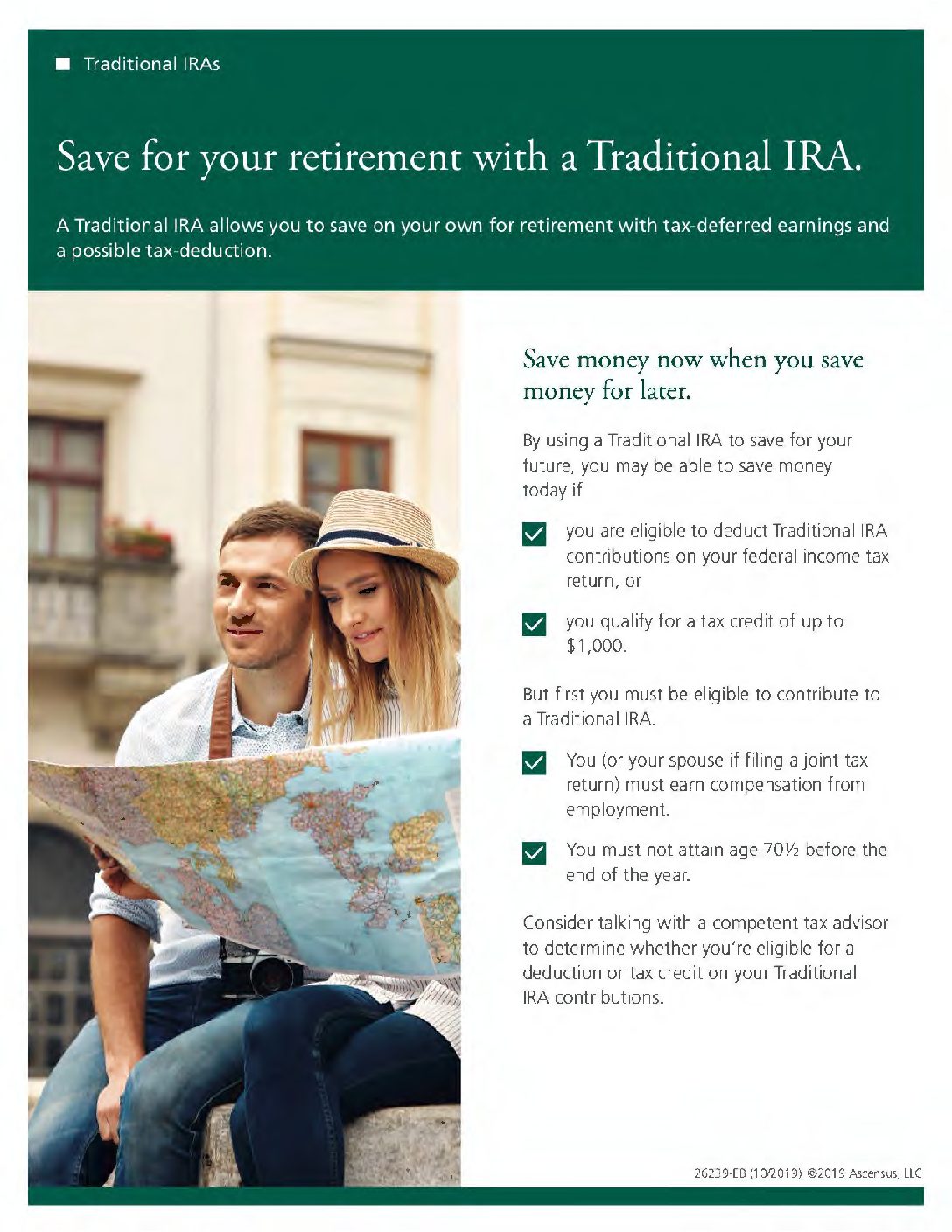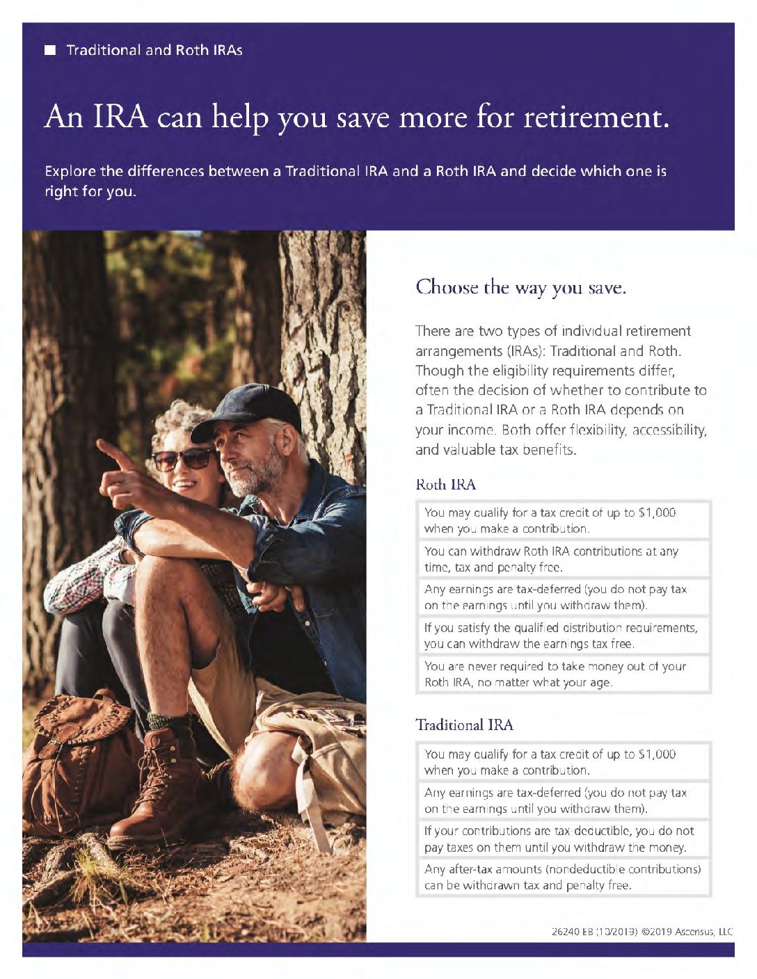An IRA account offers flexibility to allow you to start saving for your retirement. You can make a one lump sum contribution or make many throughout the year. MC Federal offers three types of IRAs to fit your savings needs. A deposit can be as little as $1.00 to a variable IRA account and just $500.00 for an IRA certificate with a set term.